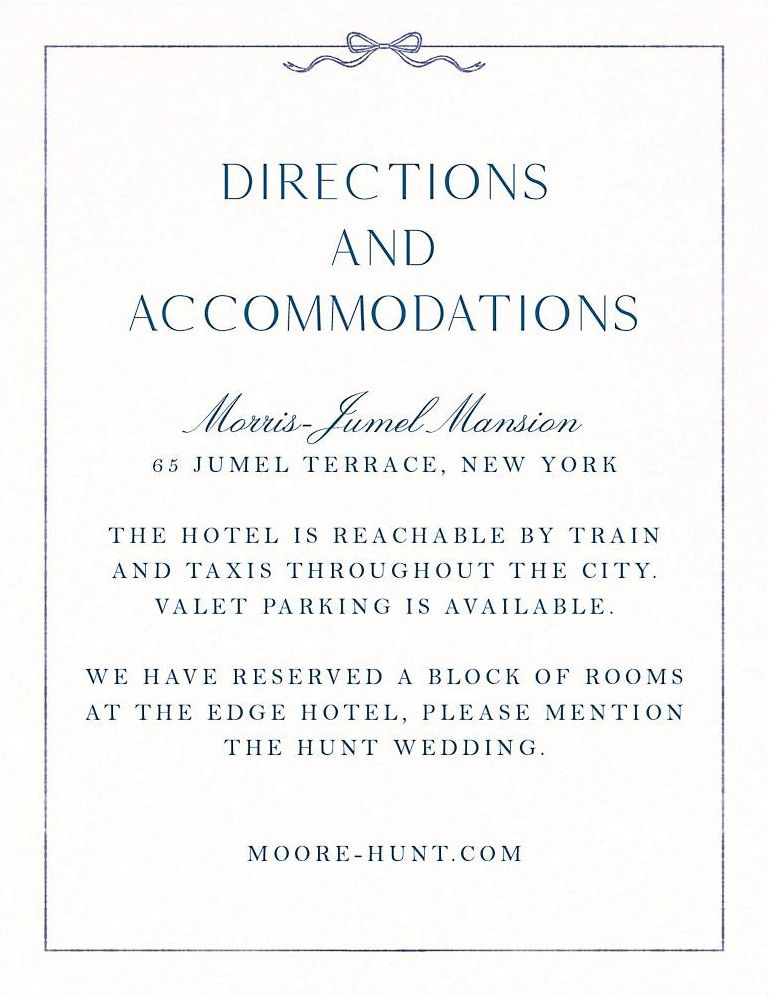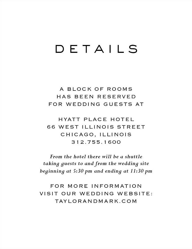 Your wedding details card should include all pertinent information regarding your wedding ceremony and reception including location details and directions, timings, dress code, accommodations, wedding website, gift registration and more!