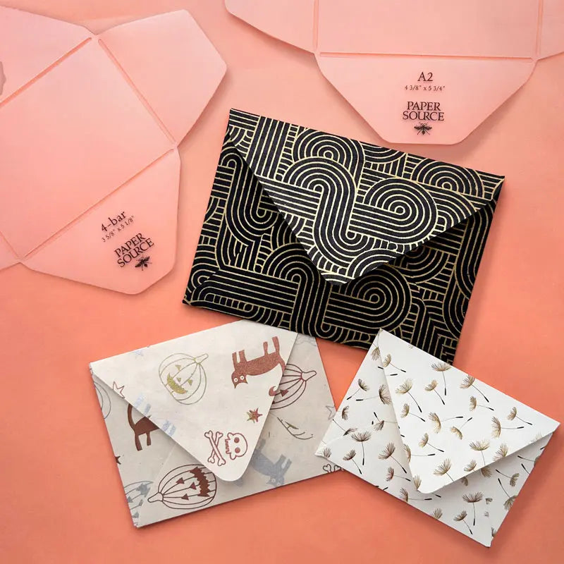 If you need standard-size envelopes or paper, we have packs of quality colored cardstock ready for purchase, both online and in store. We also carry non-standard sizes such as square envelopes and square paper. Paper Source envelopes come in A2, A6, A7, 4bar #10, square, and presentation sizes. Find folded cards, flat cards, coin envelopes, money holders, presentation envelopes, open-end envelopes, enclosures, and even various size box mailers in our exclusive selection. Shop for text paper, cardstock paper, and luxe paper in various sizing, weights, color, and more, online and in-store. The Paper Bar has all your paper crafting essentials such as DIY paper craft kits, handmade fine paper, and paper flowers. Our crafting essentials also include an extensive selection of writing instruments, sticker sets, and custom stamps.